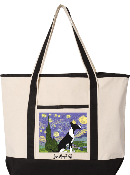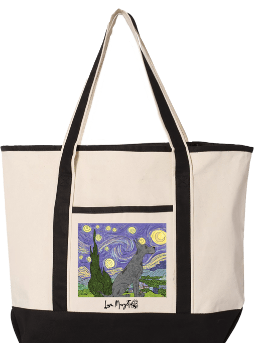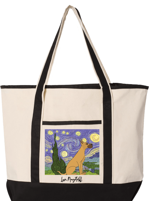 Stick a regal Great Dane in the iconic Van Gogh‘s Swirling Starry Night. Talk about pup culture! This is an awesome tote with a "washed out" graphic for that vintage street-wear feel and look. A Great Dane graphic on a LARGE heavyweight 100% canvas tote bag.